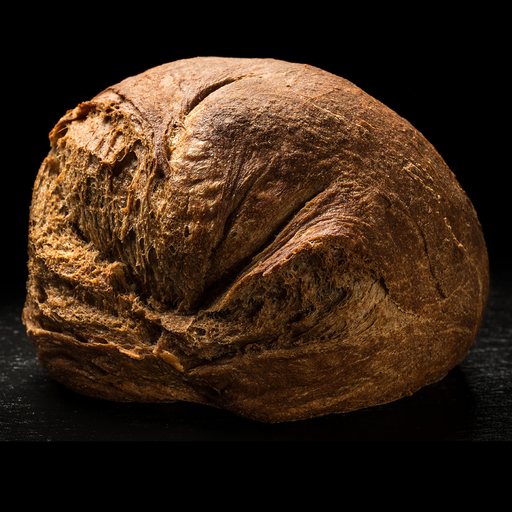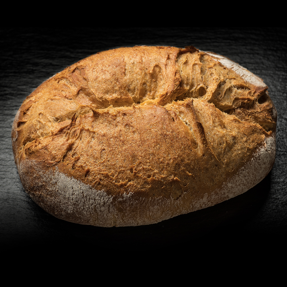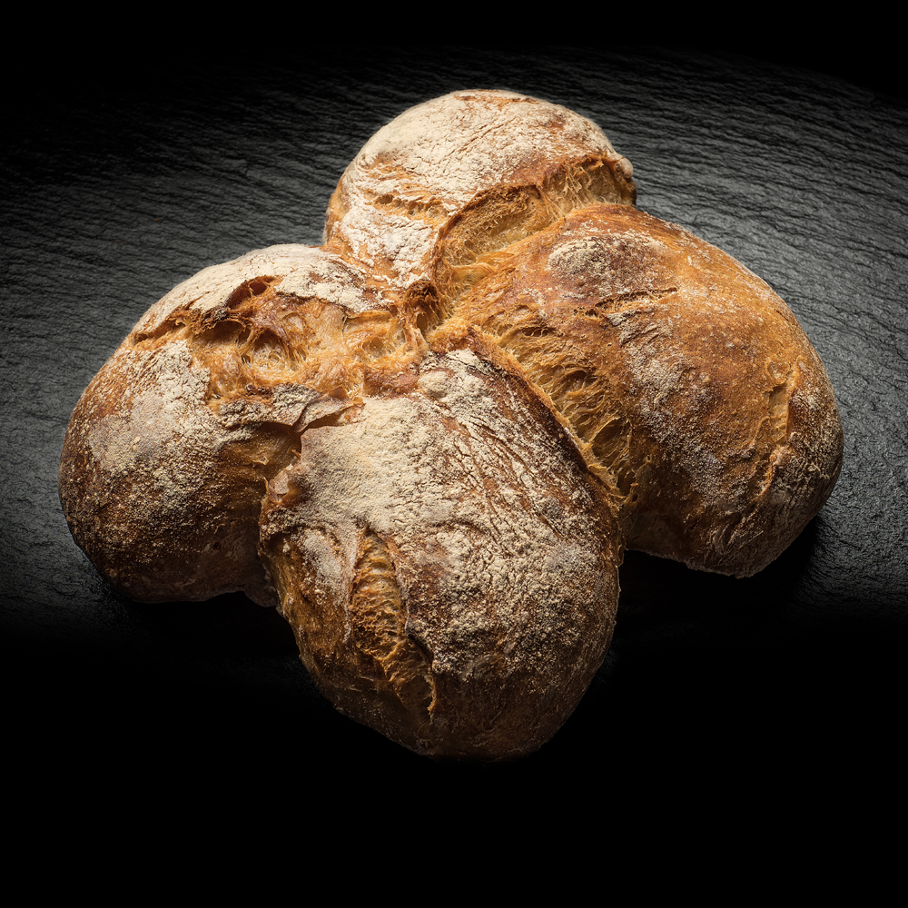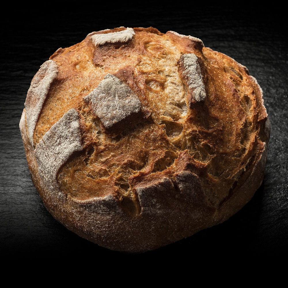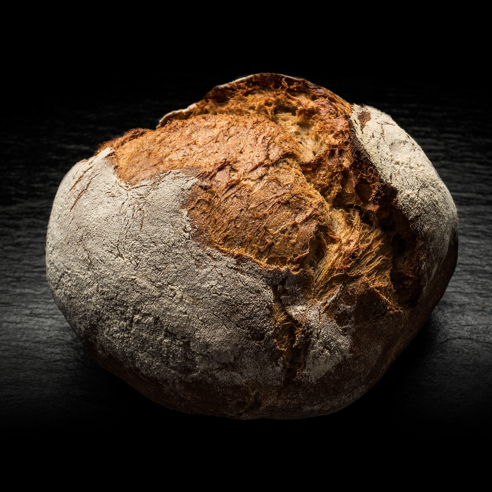 15 Stun­den Ruhe­zeit schen­ken dem Teig seine saftige Note und die dicke Kruste. In Hand­ar­beit wird der Teig gekne­tet und für den Back­ofen vorbe­rei­tet. Die charak­te­ri­sti­sche Form verlangt eini­ges an Übung. Damit der Laib beim Backen an der rich­ti­gen Stelle aufreisst, ist wahre Back­kunst gefragt. Unser Brot für echte Brot-Liebhaber.